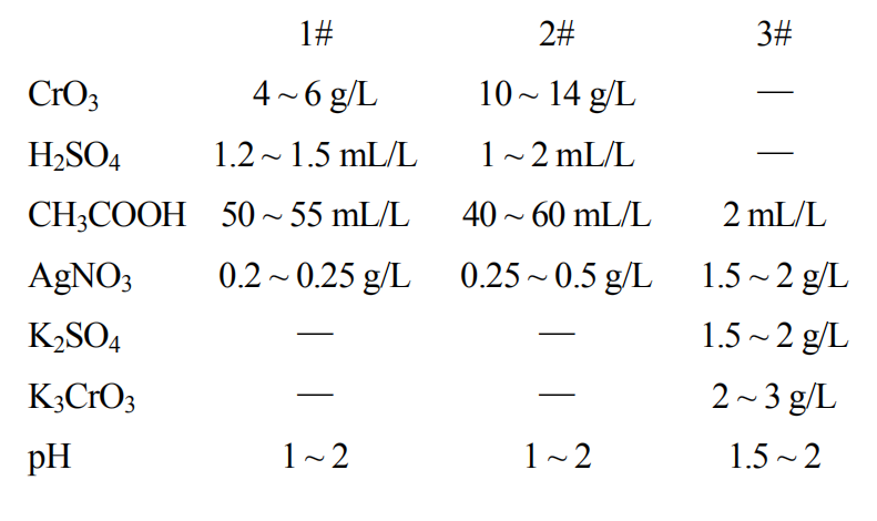 排除方法:稀釋鈍化液至pH達(dá)1~2時(shí),再按照稀釋時(shí)用去的水量來補(bǔ)充CrO3、AgNO3及CH3COOH。